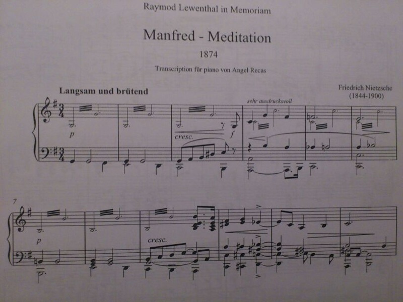 Los gustos del público del siglo XIX no hubieran comprendido ni menos aún aceptado las obras de la Escuela de Viena, o incluso de épocas posteriores del siglo XX. Las obras de Nietzsche son románticas, sí, son del siglo XIX, sí, pero suenan un poco raras, modernas, por así decirlo. En realidad, ello se debe a la impericia de Nietzsche como compositor, que logra sonoridades inesperadas por la ausencia de forma y el tratamiento de la armonía. Esto vale no sólo para la Manfred-Meditation sino para el conjunto de la obra musical de Nietzsche.